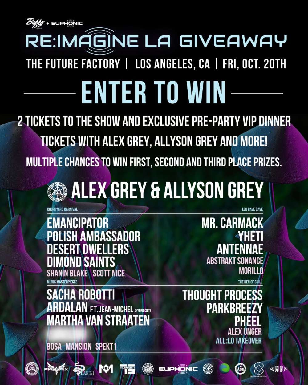 First place winners receive a pair of tickets to the Sensorial Dinner with Alex Grey and Allyson Grey. Presented by Euphonic, Bobby Dee and Mount Mushmore. 5 exquisite mushroom-inspired courses crafted by chefs Erik Armstrong, Eva Scott and Tonye Marie. Followed by a special guided conversation by Kat Walsh of Trip on This. Music by Lapa of Emancipator. Vibe curation by Boogie Plants and performance arts led by Dakini. Tickets include access to the entire RE:IMAGINE LA event and an exclusive gift basket.