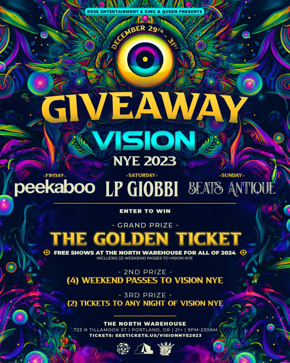 1st Prize - THE GOLDEN TICKET This grants you access to EVERY SINGLE SHOW at The North Warehouse for all of 2024! Including (2) Weekend Passes for VISION NYE