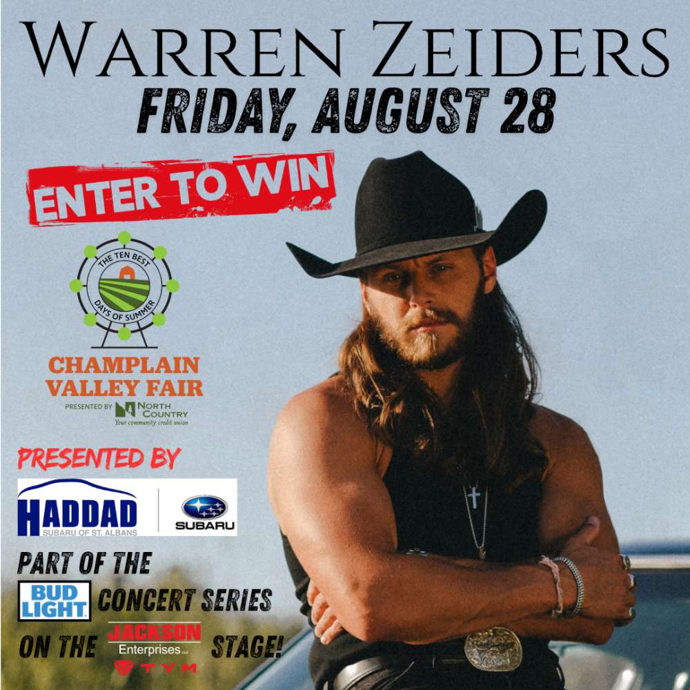 JUST ANNOUNCED: Warren Zeiders is coming to the Champlain Valley Fair on Friday, August 28th! Tickets go on sale this Thursday, October 30th at 10:00 AM, but you have the opportunity to win 'em before you can buy 'em!