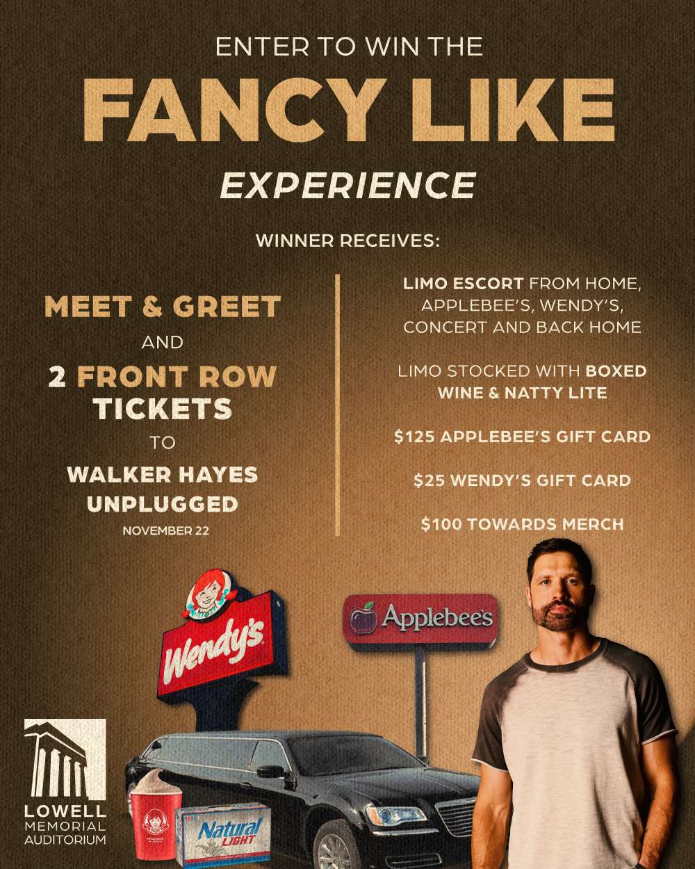 Enter for your chance to win two front row tickets to see Walker Hayes Unplugged live at Lowell Memorial Auditorium on Saturday, November 22, along with an exclusive "Fancy Like" VIP experience!