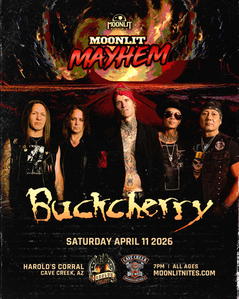 Signup for first access to tickets to Moonlit Mayhem featuring Buckcherry during Cave Creek Bike Week on Saturday, April 11 at Harold's Corral!