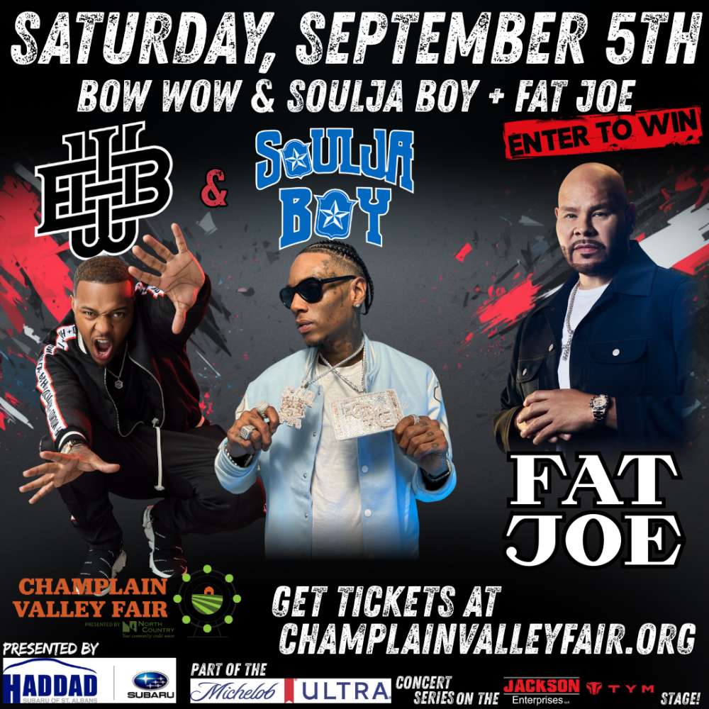ENTER TO WIN two free tickets to see Bow Wow & Soulja Boy + Fat Joe on stage LIVE at the Champlain Valley Fair on Saturday, September 5th! Tickets go on sale this Thursday, February 19th at 10:00 AM, but you have the first chance to win 'em before you can buy 'em!