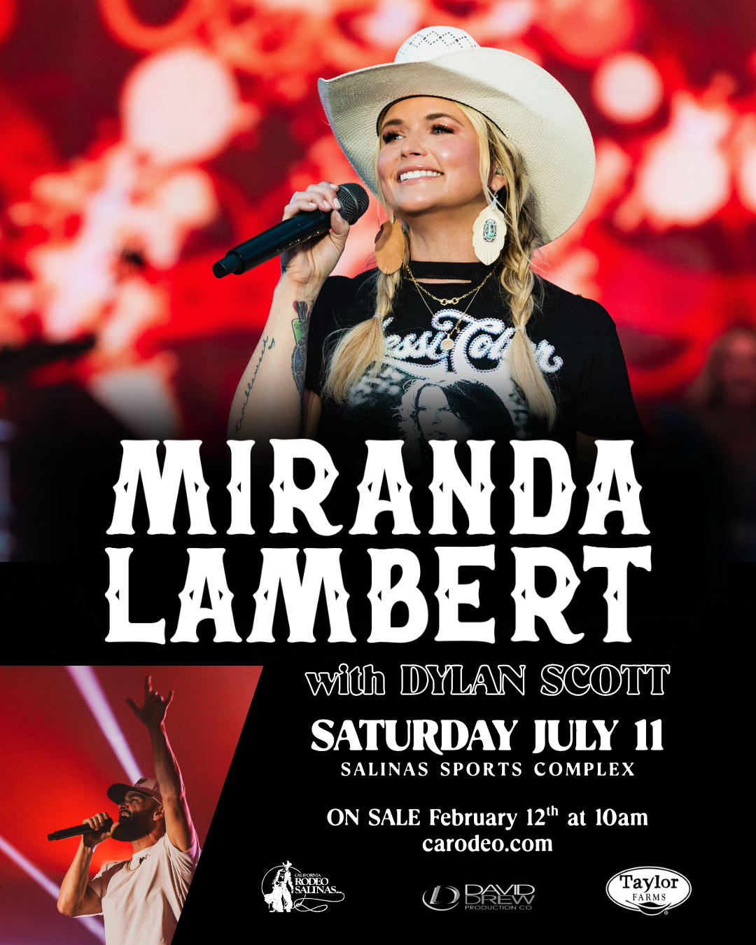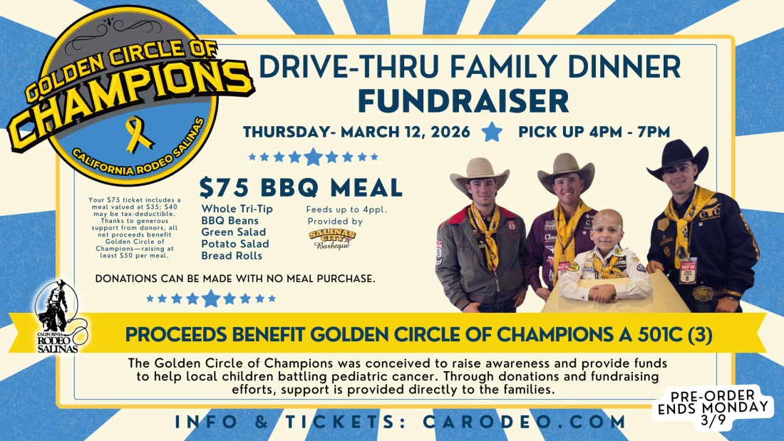 Message from the President | I hope everyone enjoyed a wonderful holiday season and is ready to kick off 2026. As we say farewell to another remarkable year, we reflect with pride on the many successful events hosted by the California Rodeo Association throughout 2025. | From the 115th California Rodeo Salinas to our Big Week Bull Riding event, the Kiddie Kapers Parade, Monster Truck Throwdown, Cowboy Poetry, Country Christmas, community celebrations, youth programs, and carnival festivities, this past year was filled with unforgettable moments that brought our community together. We were proud to once again host the Big Week Kick Off Concert and, even if it was a few weeks early, and to support a July 4th Fireworks Extravaganza, welcoming thousands of families to the Salinas Sports Complex for an evening of celebration and patriotism. None of these events would be possible without the dedication of our more than 1,400 volunteers. From early mornings to late nights, before, during, and long after the final performance, their efforts ensure that our guests, contestants, sponsors, and community experience something truly special. Their commitment, passion, and countless hours of service remain the foundation of our success. I am so proud of our Rodeo Association’s new commemorative poster that debuted in October at our annual stockholders’ meeting. As our nation prepares to celebrate its 250th birthday this year, the 2026 commemorative poster captures a powerful moment: retired Sergeant First Class James “Guido” Davis parachuting into our arena from 5,000 feet above, carrying a massive American flag — a dramatic and heartfelt tribute to rodeo’s deep-rooted patriotism. As we move into 2026, I am extremely excited for all that the California Rodeo has to offer and I hope you will join us! Let's Saddle Up! Bob Eggers President 2026-2027 | Miranda Lambert will headline the Big Week Kick Off Concert on JULY 11th! | Get your tickets this Thursday, February 12th at 10 am at carodeo.com. Click the photo for more details. | Good food, great cause: Golden Circle of Champions Barbecue Fundraiser | Now Accepting Scholarship Applications | Scholarships are available to California Rodeo Salinas Committee Members and their immediate family members. Six $5,000 scholarships will be awarded. Applications are due by March 16th. | CLICK ON THE PHOTO TO READ MORE & APPLY 2025 Recipients Pictured. Photo by Mag One Media. L-R: Kelly McCarthy Sutherland, Chairman of the California Rodeo Salinas Scholarship Committee, Lucas Milburn, Laura Hodges, Noelani Amador, Noemi Martinez, Ayden Perez, and Alexandria Perez. | Round up your friends for the Clem Albertoni Cowboy Gathering | Click on the photo to read more about the event. | Celebrate 2026 with a Commemorative Rodeo Poster | The California Rodeo Salinas has proudly unveiled its 2026 commemorative poster, a striking tribute to patriotism and tradition. This year’s design features Retired Sergeant First Class James “Guido” Davis parachuting the American flag into the arena from 5,000 feet above—a moment that has become a beloved highlight of the Rodeo. The image was crafted using two photographs by Professional Rodeo Cowboys Association Photographer Fernando Sam-Sin and stylized by graphic designer Tracy Hopper. Guido Davis, a 20-year Army veteran and former Green Beret, will celebrate his 11th year participating in the California Rodeo Salinas in 2026. With over 3,000 jumps to his name, his dedication and service continue to inspire fans and participants alike. California Rodeo Salinas President Bob Eggers, himself a veteran, shared his thoughts on the new poster: “There’s something deeply moving about seeing the American flag descend into the arena—it reminds us of the values that rodeo and our country share: grit, honor, and freedom. As a veteran, it fills me with pride to see how patriotic this sport truly is.” The commemorative posters will be sold for $20 at the California Rodeo Office located at 1034 N. Main Street in Salinas, Monday through Friday from 9 AM to 5 PM (closed Fridays from 11:45 AM–1:15 PM). Posters are also available for purchase online at https://www.carodeo.com/p/about-us/store. | Mark Your Calendar for the MONSTER TRUCK THROWDOWN on June 14 | More information coming soon! | Trail Writings from Miss California Rodeo Salinas | Can you believe it has already been over six months since the California Rodeo? I sure can’t, and I would prefer it if time slowed down. Before we know it, we’ll be celebrating the crowning of the next Miss California Rodeo Salinas. But for now and until then, we shall cherish the memories that have been made and will be made. Since the last newsletter, there has been so much that has happened and now I am excited to share all the stories with you. One of my favorite things about being a rodeo queen is getting the chance to support and promote the sport of rodeo. And at the beginning of October, I had the chance to support the return of rodeo to the Big Fresno Fair. It has been about 30 years since the last time spectators got to feel the thrill of watching the bucking broncs and bulls on the same dirt where locals have watched race horses run for the past 120 years. Let’s hope that this new event becomes a tradition for years to come. Now of course I couldn’t go through October without heading to the historic Cow Palace for the Grand National Rodeo. Living in California, you don’t get to see too many indoor rodeos which is exactly what makes this one so memorable. The arena will be pitch black as their drill team rides covered in colorful lights through their pattern. However, my favorite part is helping out with their donations collection for the Golden Circle of Champions. I’d be lying if I said I wasn’t holding back some tears as spectators generously donated what cash they had. And finally, for the month of October, I made the trip back to Salinas for the Stockholder’s